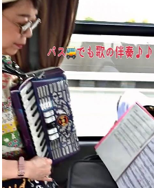 バス車中では、早朝からの参加ということでまず休憩時間をとった後、昨年視覚障がいの参加者からバスにどんな人が乗っているか知りたいとの希望があったため、全員マイクを持ち声を出しての簡単な自己紹介を行いました。さらに車中ではボランティアの役割分担や日程の紹介など事務的な連絡だけでなく、参加者のカラオケやゲストのリーダーの指導でみんなで歌をうたったりして楽しく過ごしました。みんなで歌う時間には例年 2 人の歌声リーダーが来てくださりアコーディオンや笛の伴奏で盛り上げてくださっていたのですが、今年は都合が悪くで来ていただけなかったため歌のゲスト華乃家ケイさんとのひとときでバス車中を過ごしました。