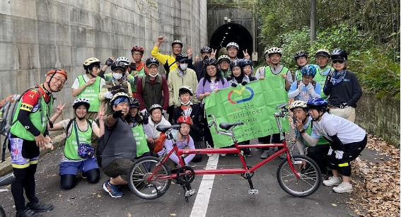 今回は、大阪からバスに36人、伴走車1台、自家用車 2 台に分乗し、さらに飛行機などの利用で現地集合の 5人の合計 47人が参加しました。参加者の内訳は、障がいのある方 23 人(内、関西 22 人・関東1人)をはじめ、CVJ や一般ボランティア、家族、ゲストなど幅広い参加者が集いました。障がい種別は知的・「広汎性」など発達障がいの方 16 人、視覚障がいの方 7 人でした。また、タンデム自転車は 1 日目 13 台、2 日目は 9 台、個人自転車は 1 日目 14 台(内、3台は電動アシスト、大阪からの持ち込み自転車 2 台)、2 日目は 13 台でのサイクリングを実施しました。このような大きなイベントが実施できたのはひとえにボランティアの方々の献身的なご尽力、共催、後援、協賛、協力をいただいた多くの団体、イベントを盛り上げてくださったゲストの方々の温かいご援助・ご支援など“多くの方々に支えられ成し遂げられたイベントだと感じております。個人的には、今回が15回目の「イベント」ということもあり、毎年、リピーターとして参加してくださっているボランティアや参加者のみなさま方と共にこれまで積み重ねてきた信頼の賜物のうえに実施できたイベントだという感がとても強くしております。今回は、事情があって台湾からの参加はなく、直前でさまざまな理由でキャンセルも数多くあったのですが、初めての四国の地でのこのイベントに関東や愛知県など遠路にもかかわらず飛行機を利用して 3人の方が参加してくださるなどとてもうれしいものとなりました。